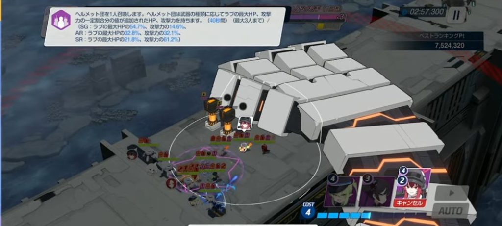 自身にEXスキル コスト2で、ヘルメット団を一人召喚・ヘルメット団は武器種に応じてHP・攻撃力が違う(ランダムで40秒・最大3人まで召喚可能)