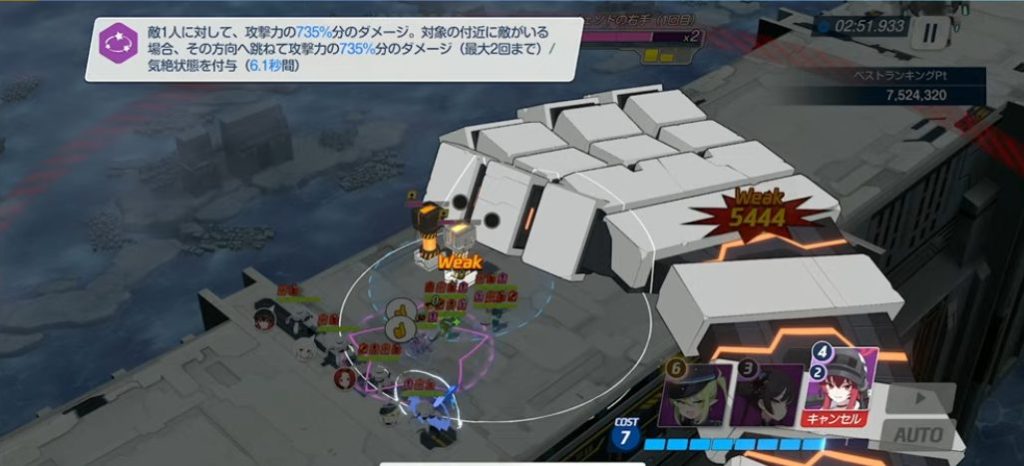 敵にEXスキル コスト4で、敵一人に攻撃力735%分のダメージ&対象の付近に敵がいる場合跳ねて攻撃力735%分のダメージ(最大2回跳ねる)&気絶状態を付与(6.1秒)